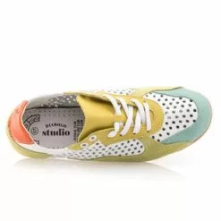 Motif perforé graphique, col de cheville orange verni, bout du pied turquoise et empiÚcements jaunes et verts : cette paire de chaussures à lacets en cuir arbore un style fun, plein de créativité ! Elle viendra instantanément égayer nos tenues de saison tout en offrant un grand confort.