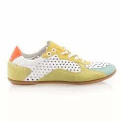 Motif perforé graphique, col de cheville orange verni, bout du pied turquoise et empiÚcements jaunes et verts : cette paire de chaussures à lacets en cuir arbore un style fun, plein de créativité ! Elle viendra instantanément égayer nos tenues de saison tout en offrant un grand confort.