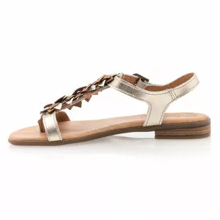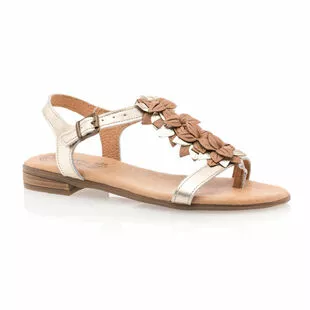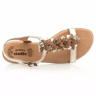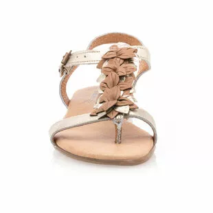 Les fines lanières dorées de ces sandales nu-pieds en cuir signées Diabolo Studio sont surmontées d’un ravissant décor camel en relief. Idée look : on imagine bien ce modèle féminin estival porté avec un pantalon fluide uni et un top beige à manches courtes.