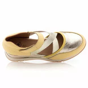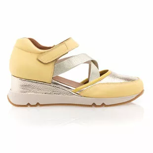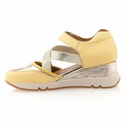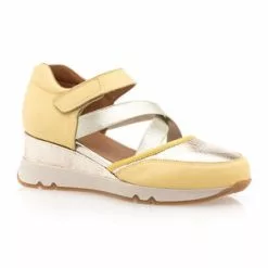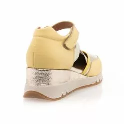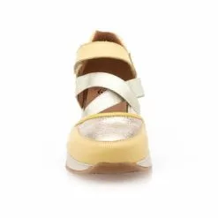 Ces chaussures ouvertes compensées en cuir jaune associent un tour de cheville à scratch et deux larges brides élastiquées dorées sur le cou-de-pied. La matière principale de ce modèle au style original est certifiée par le Leather Working Group pour son mode de production écologique et durable. On craque sans hésiter !