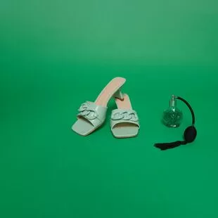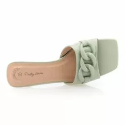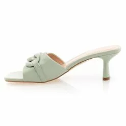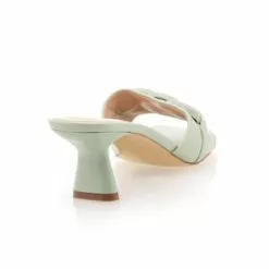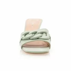 Gros coup de cœur pour cette paire de mules vertes à talon haut de 6 cm. Leur jolie nuance pastel, leur bride transversale avant avec une chaînette ton sur ton et leurs lignes soignées en font en effet un vrai trésor mode de l’été !