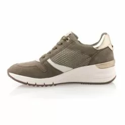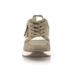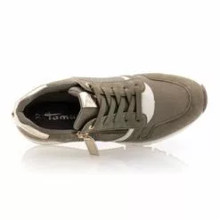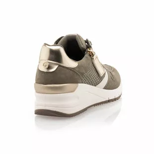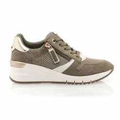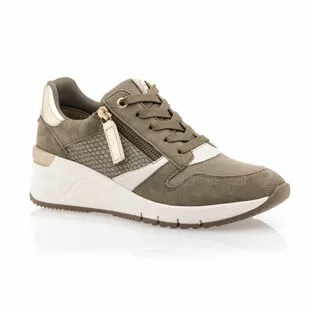 On prend de la hauteur sans perdre en confort grĂące Ă cette paire de baskets compensĂ©es Tamaris au talon de 5 cm. Ce modĂšle en cuir et matiĂšres synthĂ©tiques mĂȘle du blanc, du kaki et des touches dorĂ©es dans un design 100% addictif !