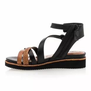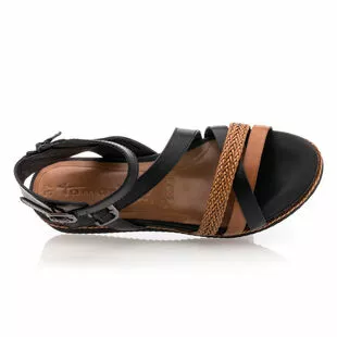 Le cuir noir de ces sandales tendances Tamaris est mis en valeur par une nuance cognac et une texture tressée sur les brides entrelacées sur le bout du pied. Ce modèle monté sur une confortable semelle compensée de 4 cm pourrait être très harmonieux porté avec une robe en denim et un sac beige par exemple.