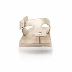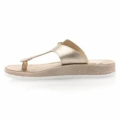 Avec leur nuance lumineuse et leur style original, ces sandales à entre-doigts en cuir doré s’imposent dans le shoesing estival féminin. Elles seraient par exemple parfaites associées à une jupe en jean délavé mi-longue et un tee-shirt en coton blanc à col V.